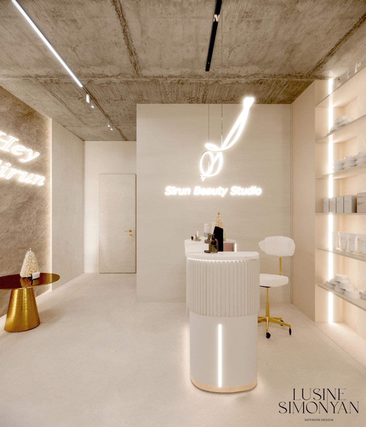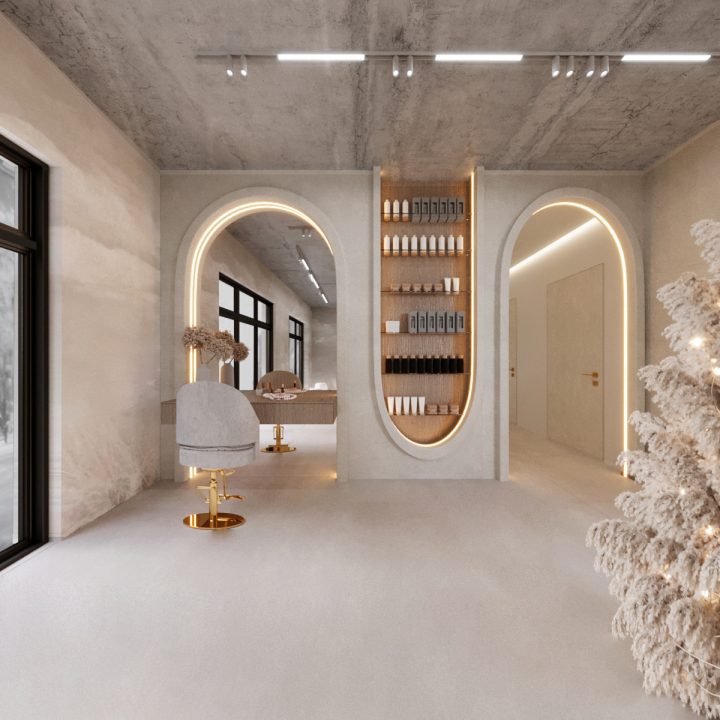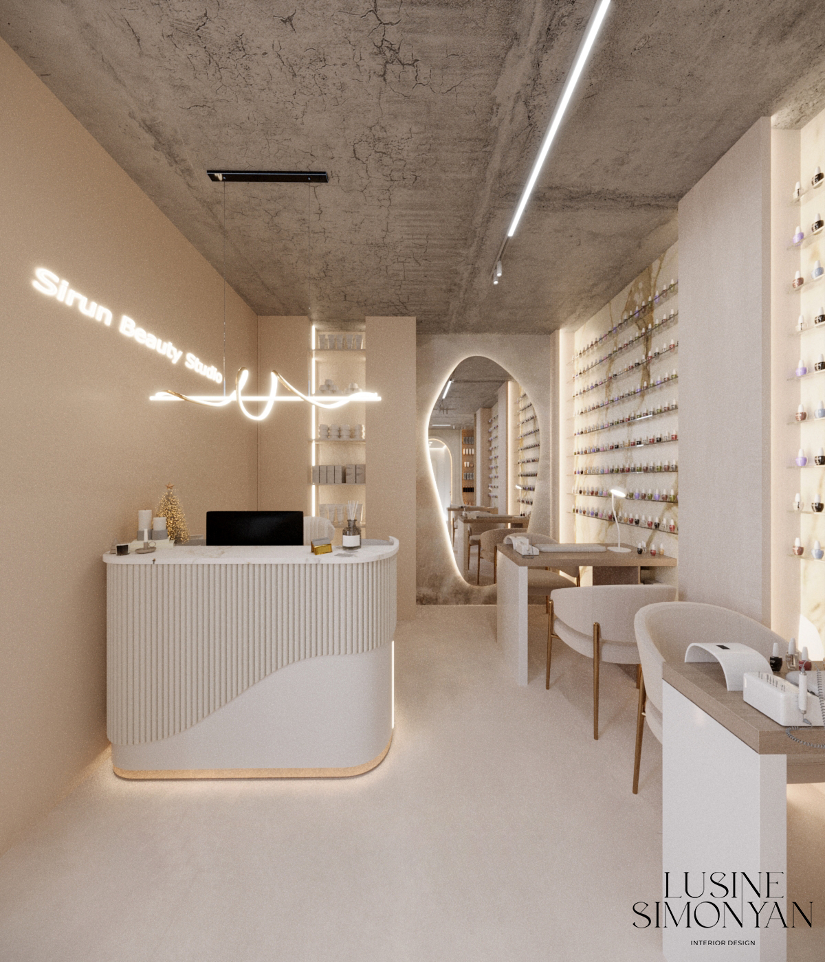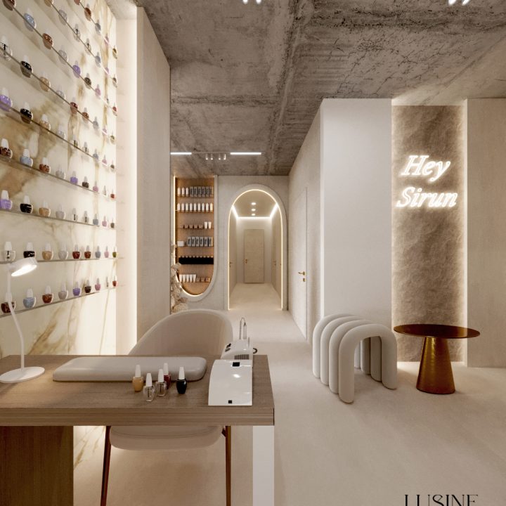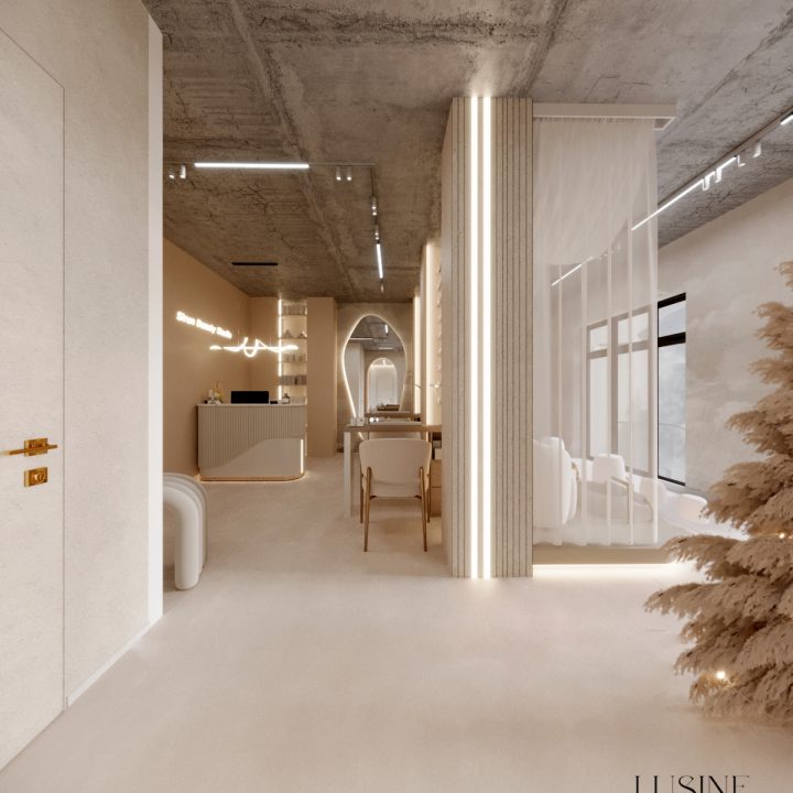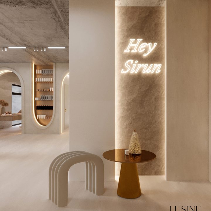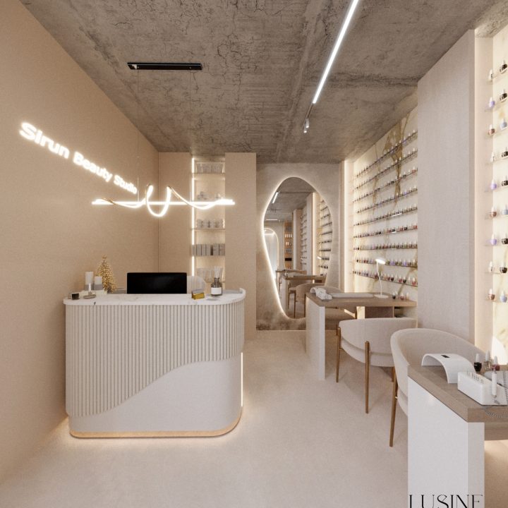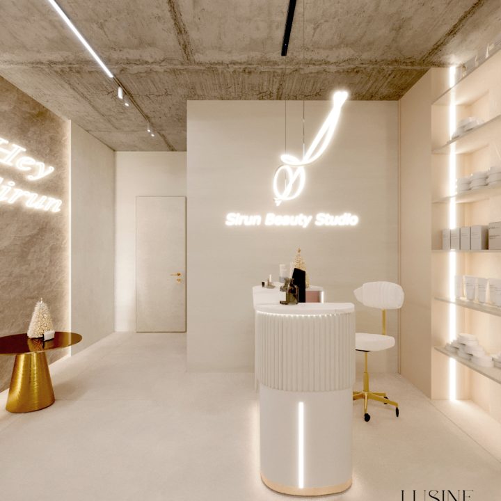 Wnętrze salonu kosmetologicznego zostało zaprojektowane w duchu nowoczesnej elegancji, łączącej minimalizm, luksusowe detale i organiczne formy. Dominują jasne, neutralne barwy – beże, złamane biele i subtelne szarości, które tworzą atmosferę spokoju i relaksu. Całość dopełniają złote akcenty, podkreślają ekskluzywny charakter przestrzeni. Projekt wnętrza został stworzony z myślą o komforcie zarówno klientów, jak i pracowników. “Sirun Beauty Studio” to miejsce, gdzie design spotyka się z funkcjonalnością. Projekt wnętrza łączy nowoczesność, subtelny luksus i ergonomię, tworząc idealne warunki do profesjonalnej pielęgnacji i relaksu. Dzięki starannie dobranym materiałom, precyzyjnemu oświetleniu oraz dopracowanym detalom salon wyróżnia się na tle konkurencji, oferując klientom nie tylko usługi na najwyższym poziomie, ale także wyjątkowe doświadczenie estetyczne.