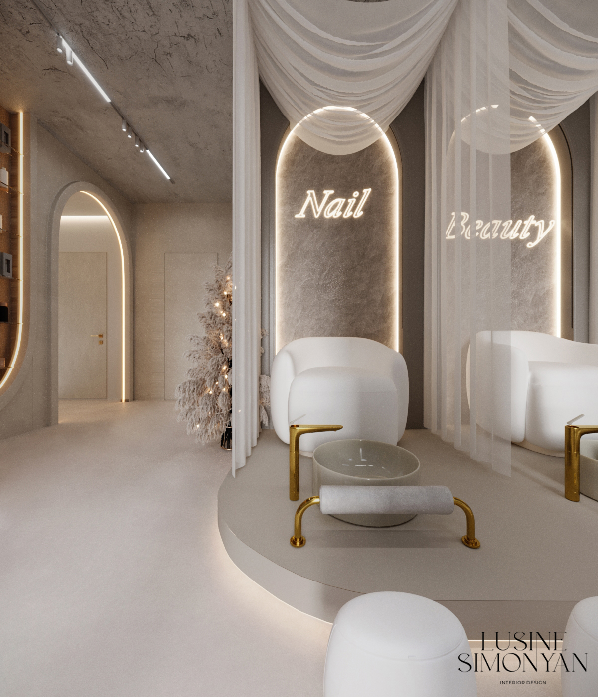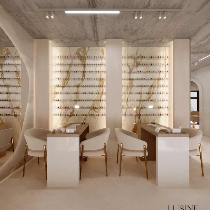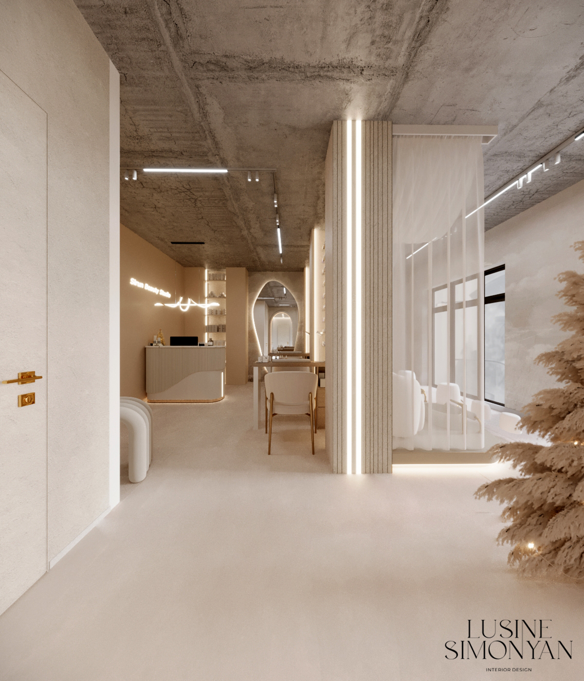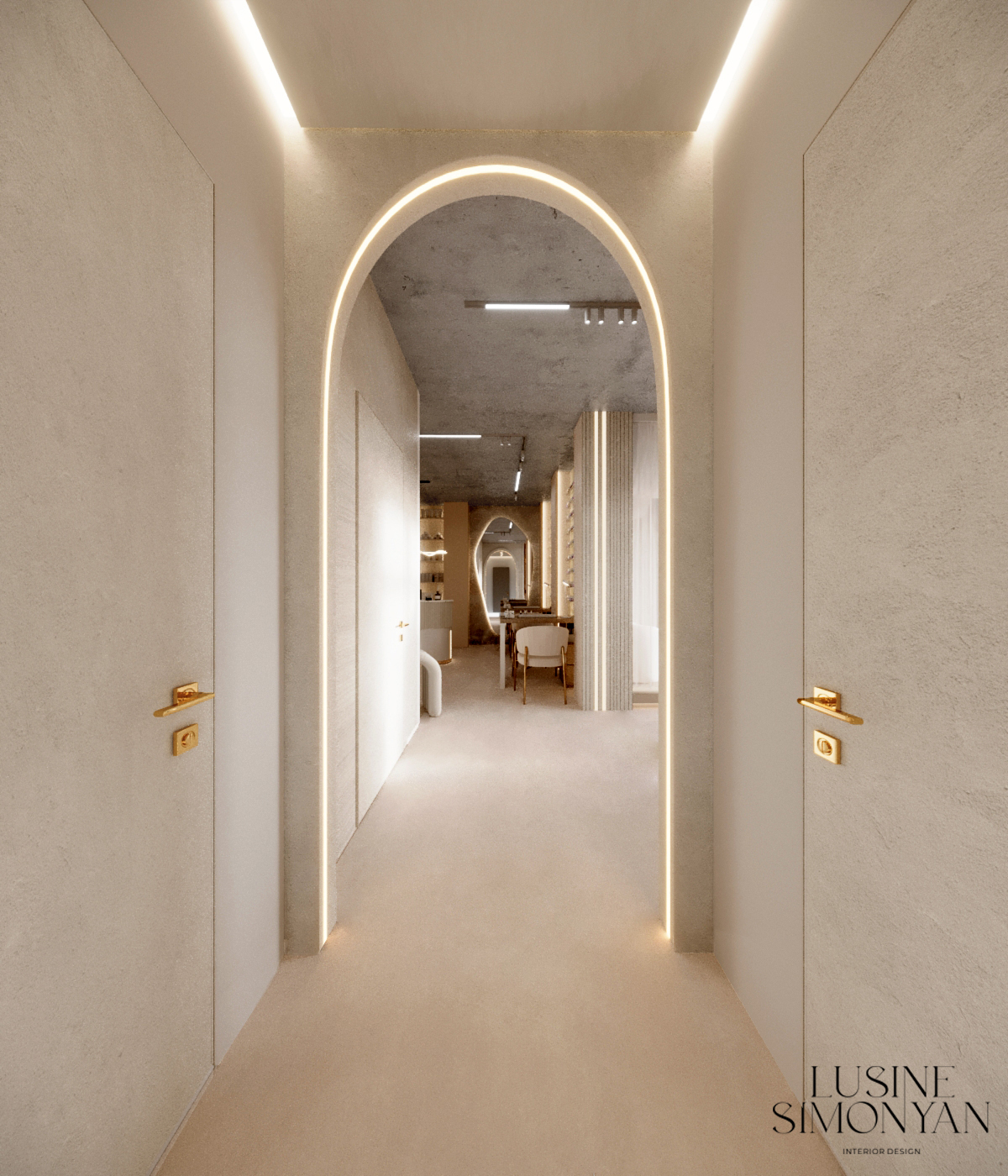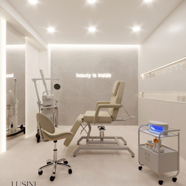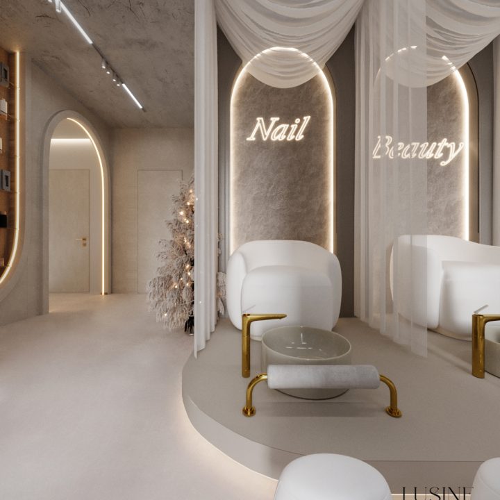 Wnętrze salonu kosmetologicznego zostało zaprojektowane w duchu nowoczesnej elegancji, łączącej minimalizm, luksusowe detale i organiczne formy. Dominują jasne, neutralne barwy – beże, złamane biele i subtelne szarości, które tworzą atmosferę spokoju i relaksu. Całość dopełniają złote akcenty, podkreślają ekskluzywny charakter przestrzeni. Projekt wnętrza został stworzony z myślą o komforcie zarówno klientów, jak i pracowników. “Sirun Beauty Studio” to miejsce, gdzie design spotyka się z funkcjonalnością. Projekt wnętrza łączy nowoczesność, subtelny luksus i ergonomię, tworząc idealne warunki do profesjonalnej pielęgnacji i relaksu. Dzięki starannie dobranym materiałom, precyzyjnemu oświetleniu oraz dopracowanym detalom salon wyróżnia się na tle konkurencji, oferując klientom nie tylko usługi na najwyższym poziomie, ale także wyjątkowe doświadczenie estetyczne.