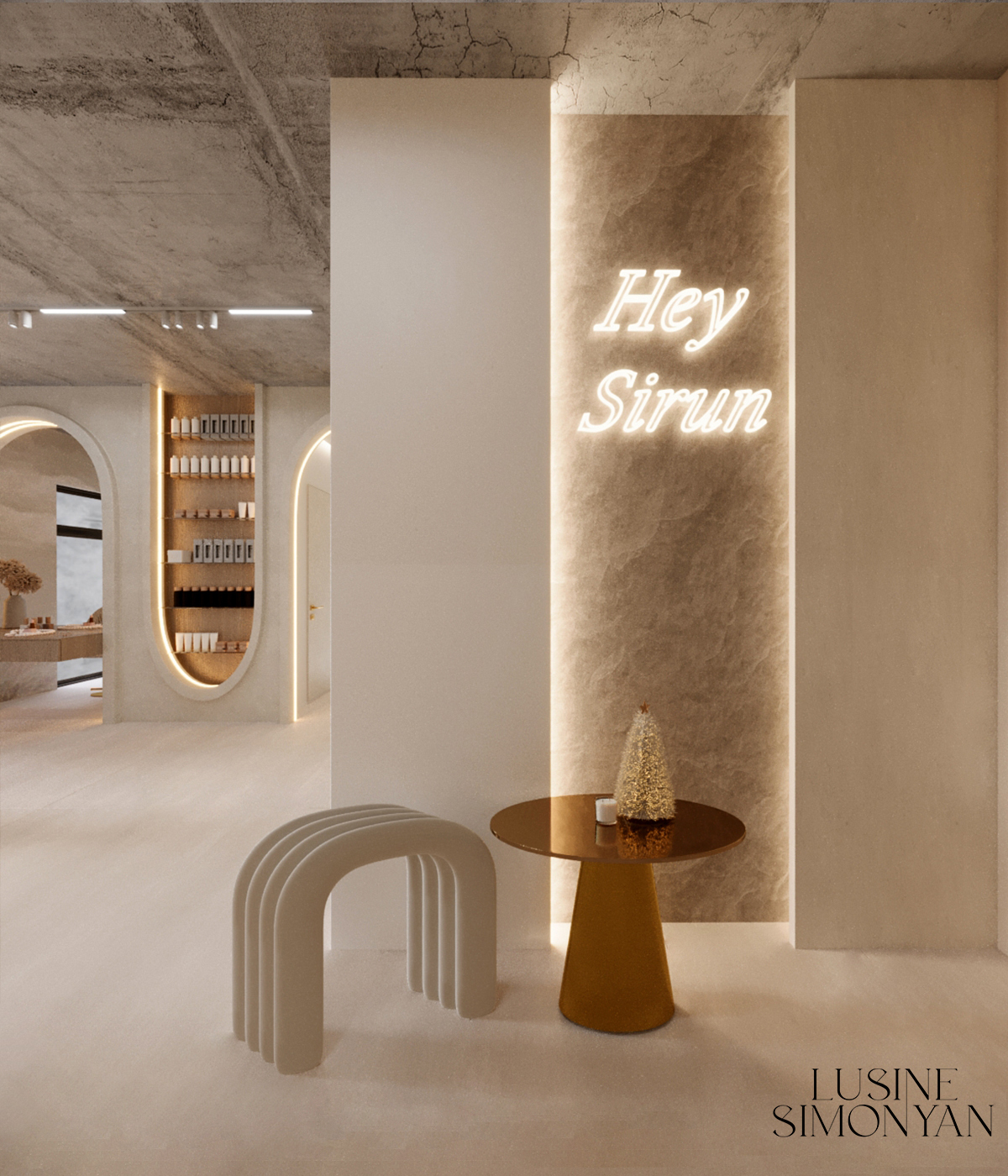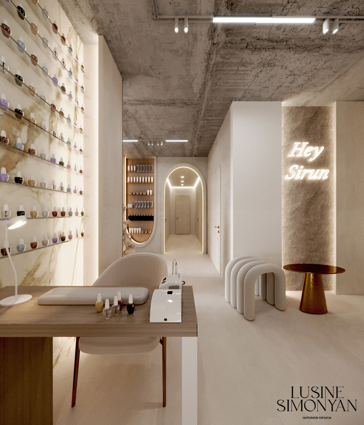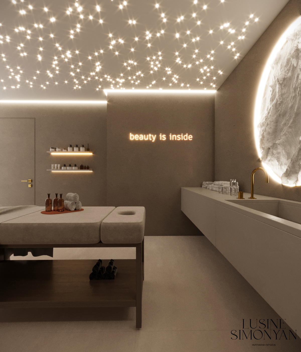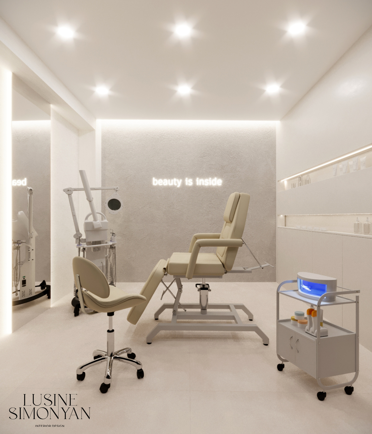 Wnętrze salonu kosmetologicznego zostało zaprojektowane w duchu nowoczesnej elegancji, łączącej minimalizm, luksusowe detale i organiczne formy. Dominują jasne, neutralne barwy – beże, złamane biele i subtelne szarości, które tworzą atmosferę spokoju i relaksu. Całość dopełniają złote akcenty, podkreślają ekskluzywny charakter przestrzeni. Projekt wnętrza został stworzony z myślą o komforcie zarówno klientów, jak i pracowników. “Sirun Beauty Studio” to miejsce, gdzie design spotyka się z funkcjonalnością. Projekt wnętrza łączy nowoczesność, subtelny luksus i ergonomię, tworząc idealne warunki do profesjonalnej pielęgnacji i relaksu. Dzięki starannie dobranym materiałom, precyzyjnemu oświetleniu oraz dopracowanym detalom salon wyróżnia się na tle konkurencji, oferując klientom nie tylko usługi na najwyższym poziomie, ale także wyjątkowe doświadczenie estetyczne.