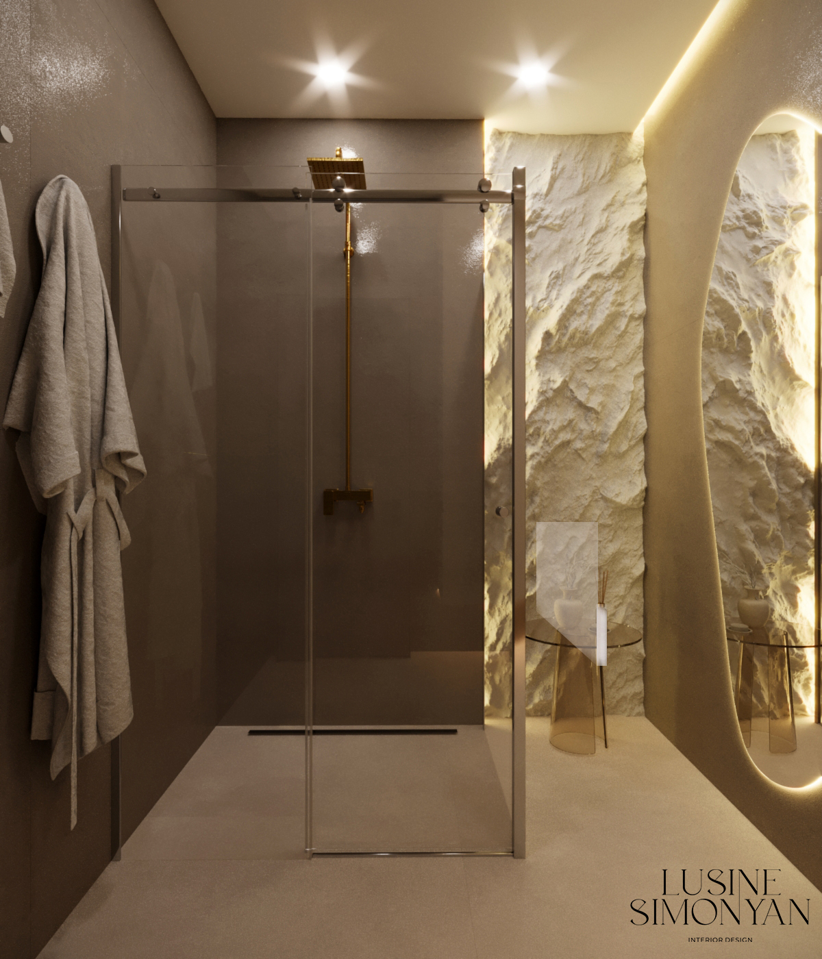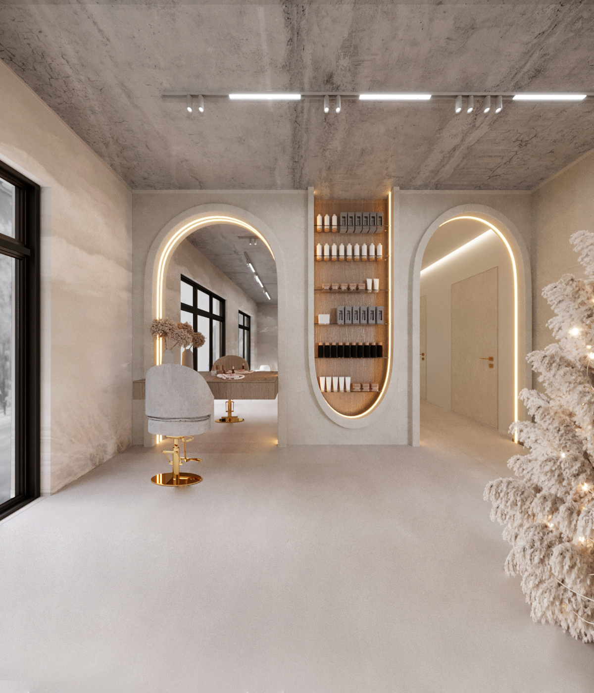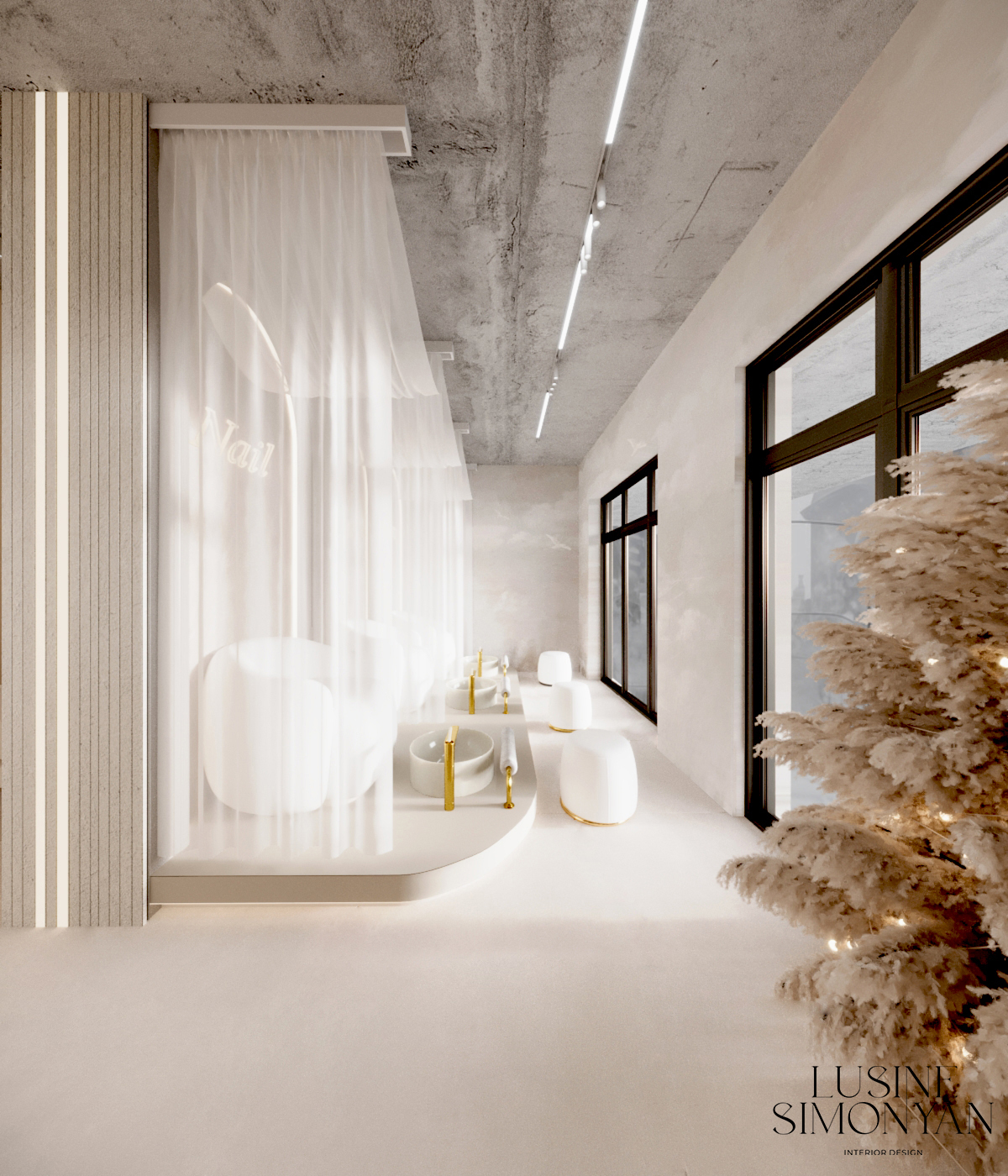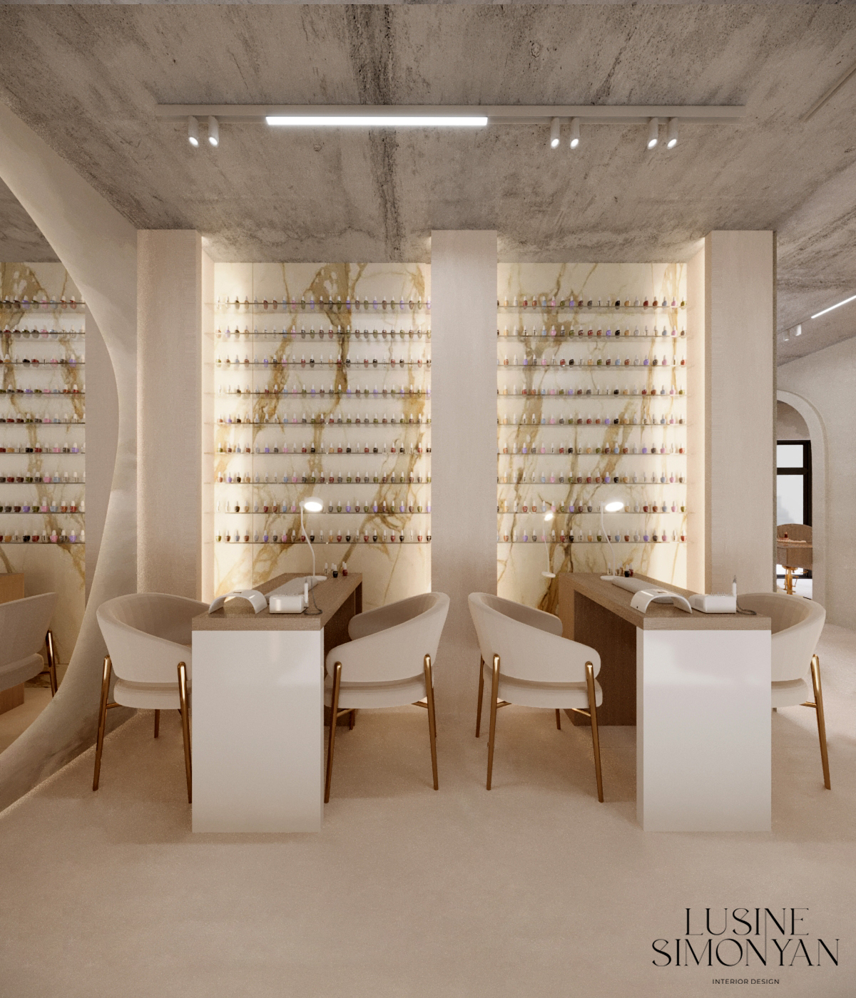 Wnętrze salonu kosmetologicznego zostało zaprojektowane w duchu nowoczesnej elegancji, łączącej minimalizm, luksusowe detale i organiczne formy. Dominują jasne, neutralne barwy – beże, złamane biele i subtelne szarości, które tworzą atmosferę spokoju i relaksu. Całość dopełniają złote akcenty, podkreślają ekskluzywny charakter przestrzeni. Projekt wnętrza został stworzony z myślą o komforcie zarówno klientów, jak i pracowników. “Sirun Beauty Studio” to miejsce, gdzie design spotyka się z funkcjonalnością. Projekt wnętrza łączy nowoczesność, subtelny luksus i ergonomię, tworząc idealne warunki do profesjonalnej pielęgnacji i relaksu. Dzięki starannie dobranym materiałom, precyzyjnemu oświetleniu oraz dopracowanym detalom salon wyróżnia się na tle konkurencji, oferując klientom nie tylko usługi na najwyższym poziomie, ale także wyjątkowe doświadczenie estetyczne.